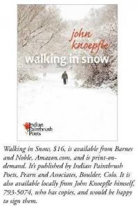 John Knoepfle’s new book of poetry The bitter cold subsided and we finally got a nice snow. I went walking under the streetlights with four-year-old Xavier. We caught snowflakes on our tongues, found sticks to scratch our names in the pristine whiteness and followed our own tracks home where I sat down with John Knoeple’s new book, Walking in Snow. The book reads as a meditation on the passing of time.