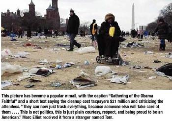 First off, your title, “Gathering of the Obama Faithful” leaves me with the impression that you are not a supporter of the new President. In fact, there is something subtly racist about your e-mail. Are you unhappy that upwards of 2 million Americans converged upon our Capitol to celebrate “regime change”? Or are you experiencing sour grapes over the fact that a black American is now your leader? If you really are a concerned taxpayer, ponder this: 156 million Americans filed taxes last year. Dividing that $21 million by the number of (then) working taxpayers equals 13 cents per person going towards cleaning up after maybe one of the most priceless events in our history.