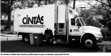 We estimate that we shredded around 6,500 pounds of paper on Saturday. Since all of the paper is 100 percent recycled, this equates to saving approximately 55 trees, 22,750 gallons of water and 10 cubic yards of landfill space.