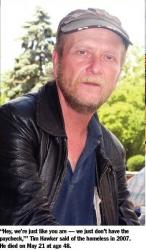 “He died from being homeless,” she says, adding: “You shouldn’t have to wait until you’re in a casket to have a permanent home.” Hawker, who was one of about two dozen homeless people who slept at Lincoln Library before the city ended the practice in June 2007, slipped into a diabetic coma on Tuesday, May 19; he died two days later.