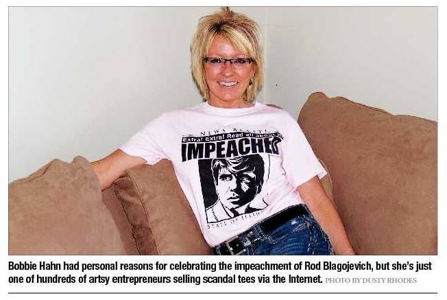 Bobbie Hahn had personal reasons for celebrating the impeachment of Rod Blagojevich, but she’s just one of hundreds of artsy entrepreneurs selling scandal tees via the Internet. PHOTO BY DUSTY RHODES