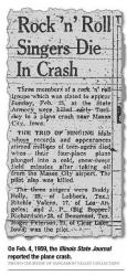 The plane crash itself was considered pilot error, as Peterson was not certified to fly by instrumentation and the poor visibility at night was coupled with icy conditions. The plane and victims were discovered the following morning, covered by a light dusting of snow that obscured the wreckage. The Juhl family’s beanfield passed into a de facto memorial site that day, as Richardson’s body was thrown 40feet beyond the plane, with Holly and Valens crumpled after ejection less than 20 feet away. “Tommy and I have had brief chats about the coin toss, but neither one of us get uptight about it,” said Hale. “We both agree, who tossed the coin is really irrelevant...the result is the vital fact.” The tour had been scheduled for stops at Spring Valley’s Les Buzz Ballroom Feb. 7, The Peoria Armory Feb. 14, and the final show, Feb. 15, at the Springfield Armory. A small item in the Springfield newspaper noted that the plane crash killed three members of a rock and roll band “which was slated to appear Sunday, Feb. 15” at the Armory in Springfield.