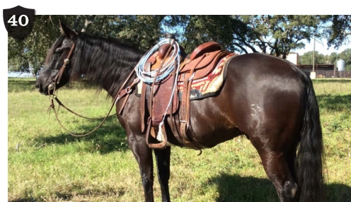 Notes: Absolutely stunning 9-year-old black gelding stands 15 .1h, he is the full package . Not only can you head and heel on him, he is built as good as it gets, outshines any horse next to him in looks and how he works, they do not get any better than this gelding . He is a sale highlight . On the head side he leaves flat across the line, runs, rates, has a great move and faces excellent. On the heel side expect the same look every time . Stops amazing! He is seasoned and has been hauled to the US and World Series ropings and won on . He will be your No . 1 horse to haul . I can’t say enough good things about him . Come see him work in the preview and call/text with questions 903.814.4526. Video will be available on YouTube under “Music To Luke.”