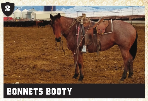Notes:“Booty” is one of the best ranch horses I have had. She has done every aspect of ranch work for the past four years I have had her. Sorting, lots of doctoring/roping outside. Very tough but laid back. Been heading and heeling on her for the past year, ready to go in any direction.