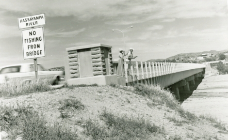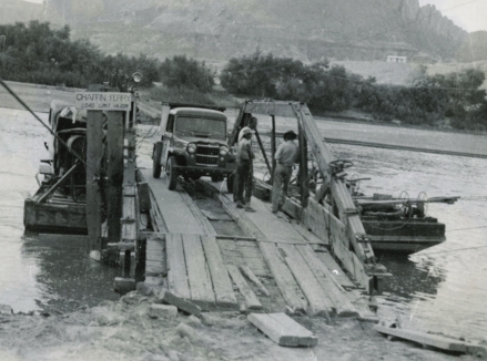 Left: Unauthorized fishing on the Hassayampa Bridge (now the Riverwalk), mid 1900s. Right: The Chaffin Ferry over the Hassayampa River, early 1900s. Photos courtesy Desert Caballeros Western Museum Archives.
