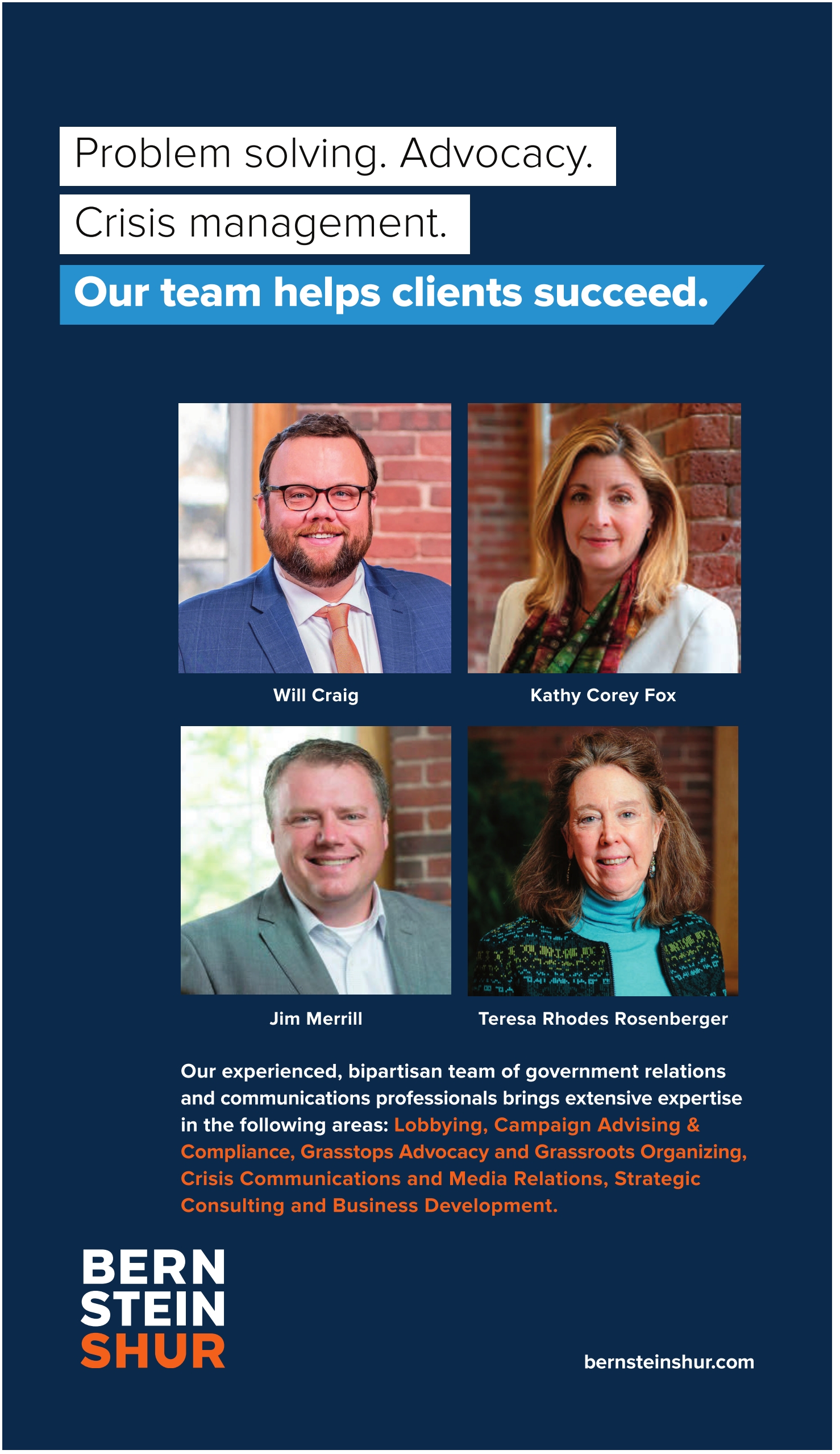 Our experienced, bipartisan team of government relations and communications professionals brings extensive expertise in the following areas: Lobbying, Campaign Advising & Compliance, Grasstops Advocacy and Grassroots Organizing, Crisis Communications and Media Relations, Strategic Consulting and Business Development.