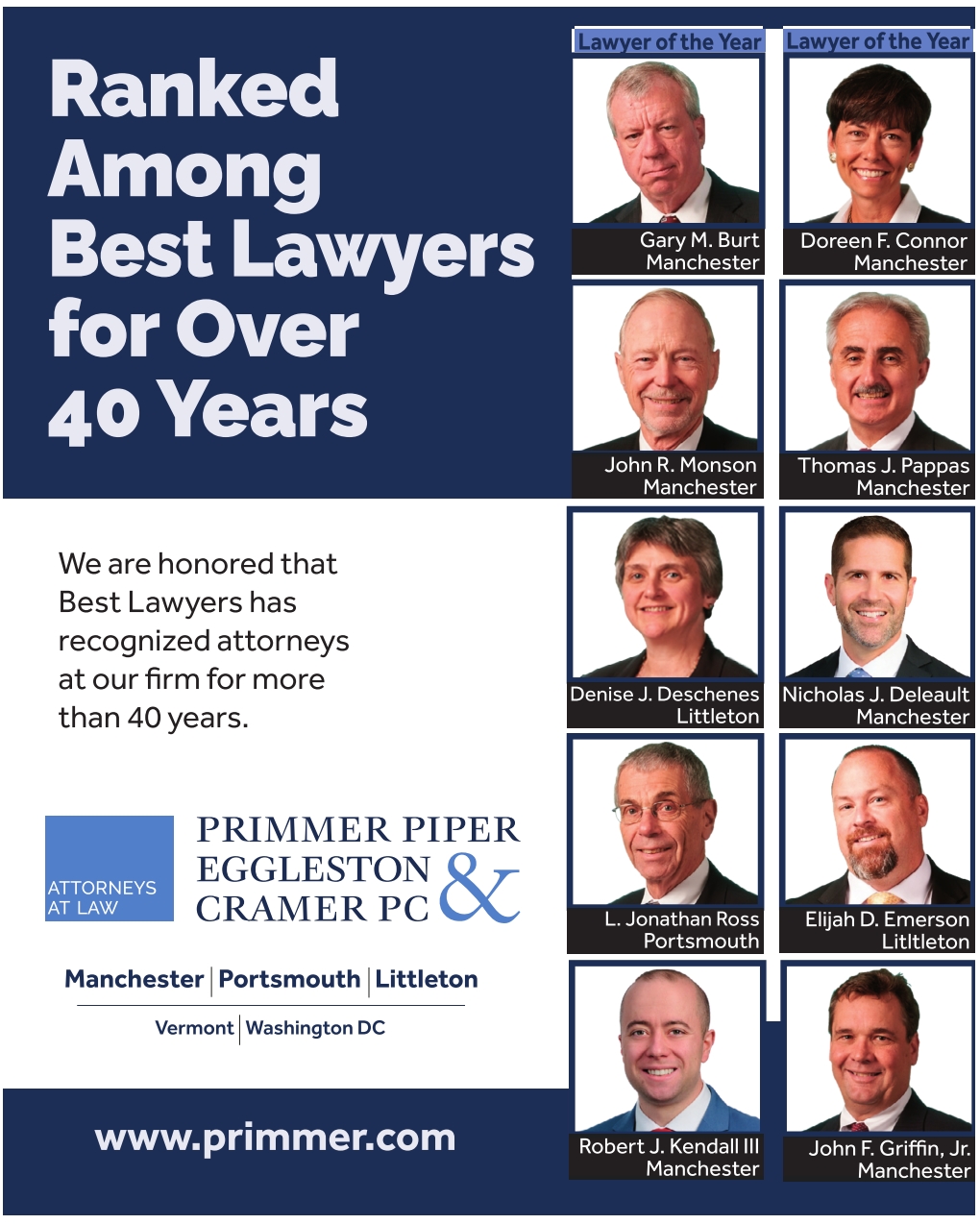 Ranked Among Best Lawyers for Over 40 Years We are honored that Best Lawyers has recognized attorneys at our firm for more than 40 years. Manchester Portsmouth Littleton Vermont Washington DC Lawyer of the Year Gary M. Burt Manchester John R. Monson Manchester Denise J. Deschenes Littleton L. Jonathan Ross Portsmouth Lawyer of the Year Doreen F. Connor Manchester Thomas J. Pappas Manchester Nicholas J. Deleault Manchester Elijah D. Emerson Litltleton www.primmer.com Robert J. Kendall III Manchester John F. Griffin, Jr. Manchester