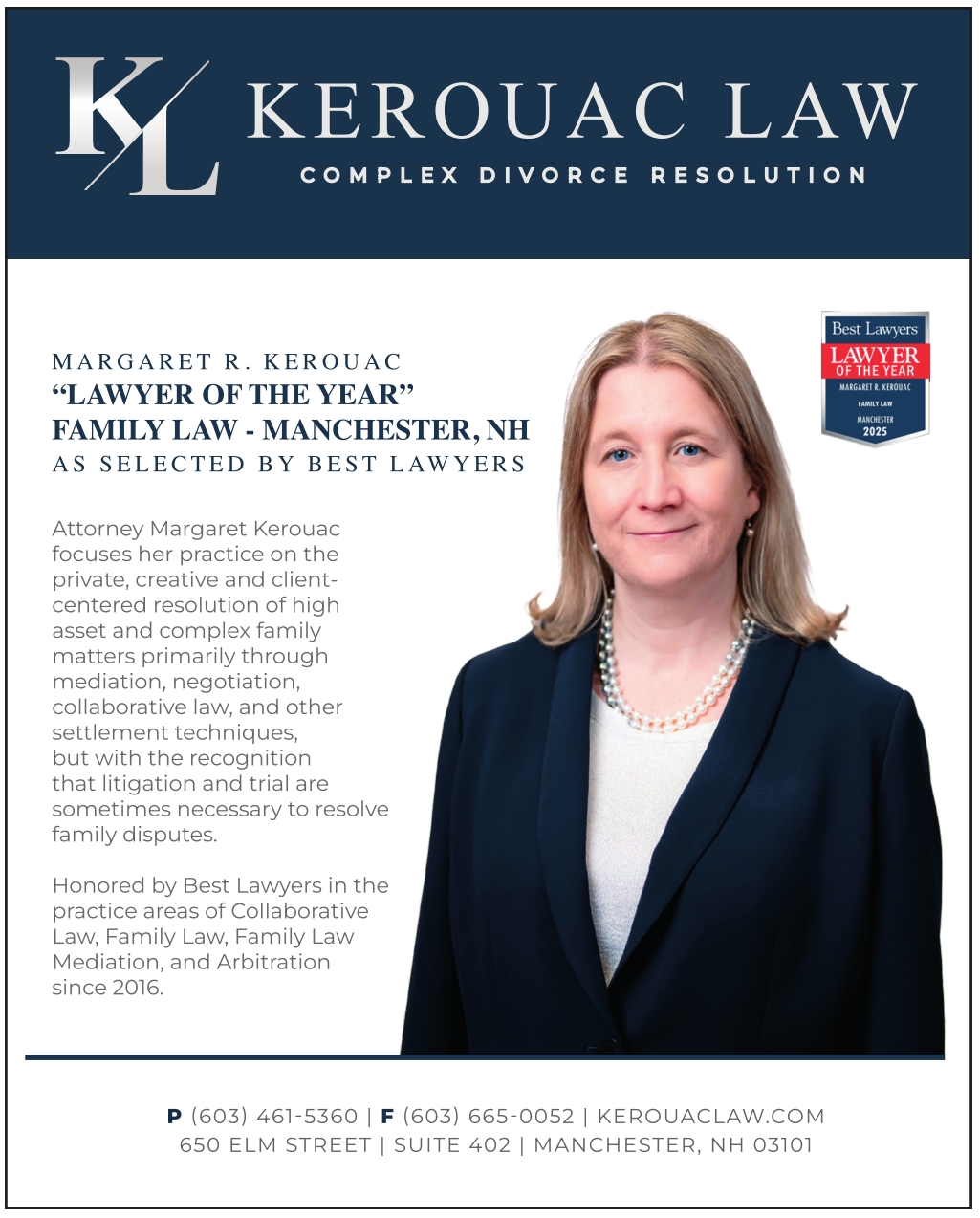 MARGARET R. KEROUAC “LAWYER OF THE YEAR” FAMILY LAW - MANCHESTER, NH AS SELECTED BY BEST LAWYERS Attorney Margaret Kerouac focuses her practice on the private, creative and clientcentered resolution of high asset and complex family matters primarily through mediation, negotiation, collaborative law, and other settlement techniques, but with the recognition that litigation and trial are sometimes necessary to resolve family disputes. Honored by Best Lawyers in the practice areas of Collaborative Law, Family Law, Family Law Mediation, and Arbitration since 2016. P (603) 461-5360 | F (603) 665-0052 | KEROUACLAW.COM 650 ELM STREET | SUITE 402 | MANCHESTER, NH 03101