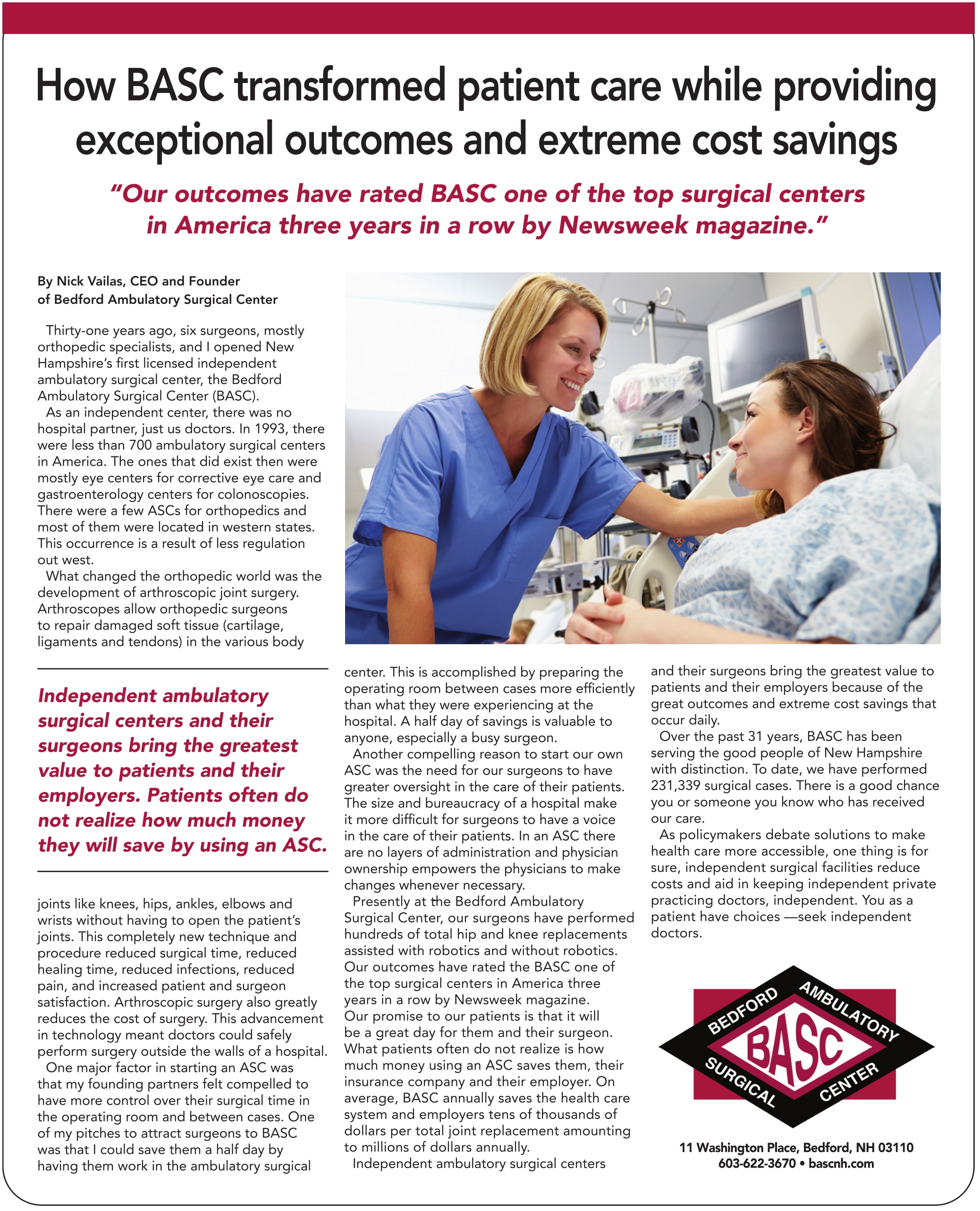 Thirty-one years ago, six surgeons, mostly orthopedic specialists, and I opened New Hampshire’s first licensed independent ambulatory surgical center, the Bedford Ambulatory Surgical Center (BASC).