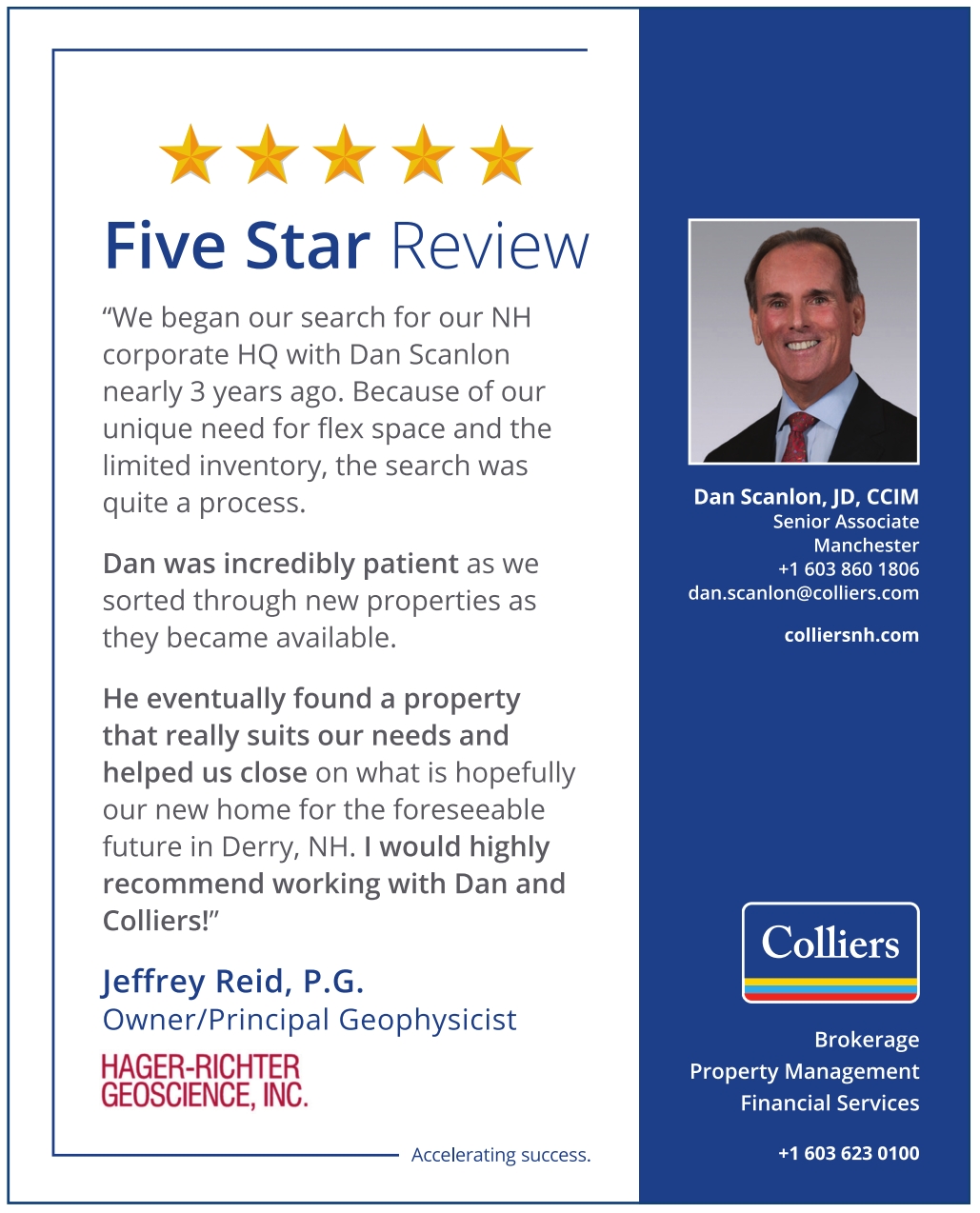 He eventually found a property that really suits our needs and helped us close on what is hopefully our new home for the foreseeable future in Derry, NH. I would highly recommend working with Dan and Colliers!”