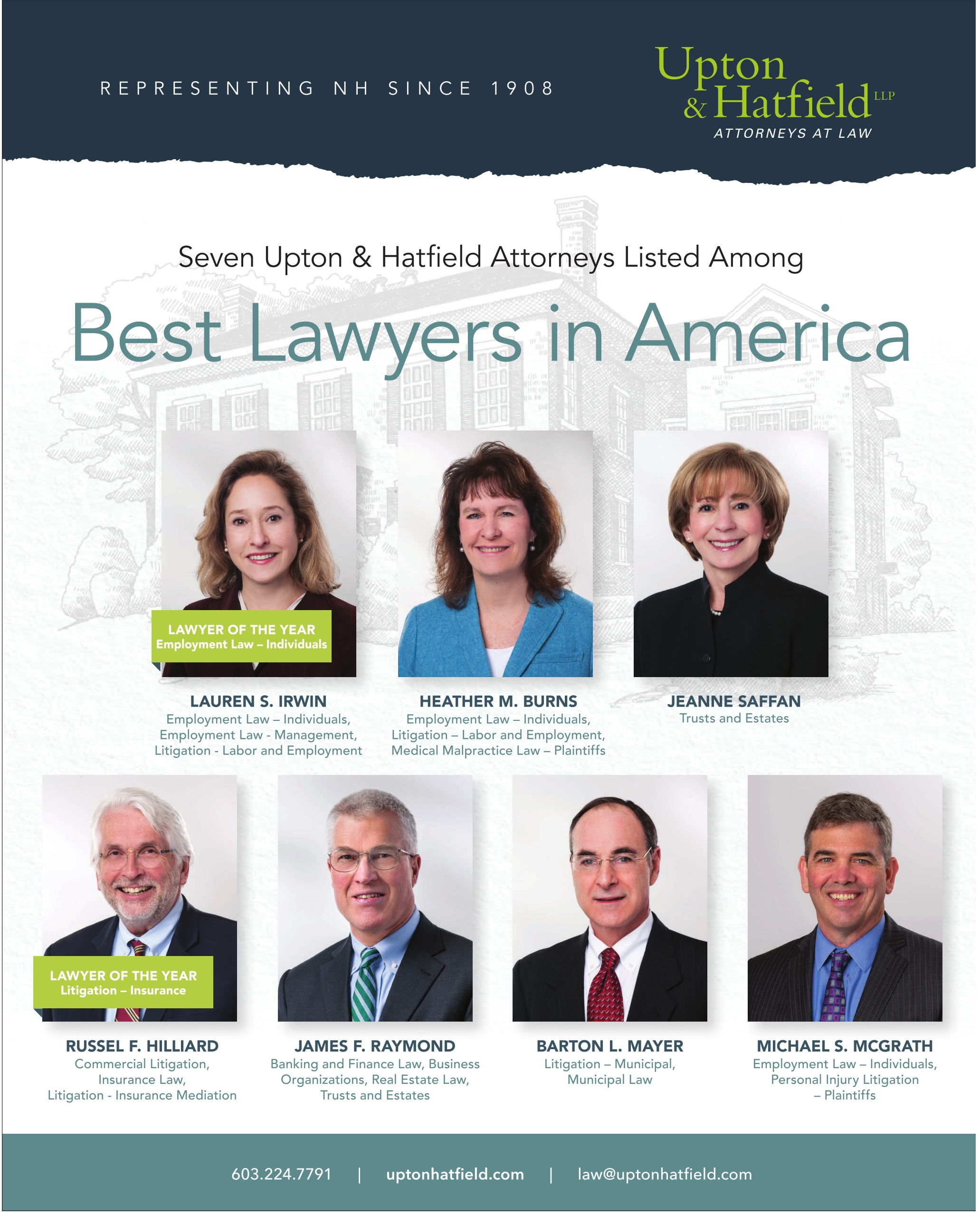 R E P R E S E N T I N G N H S I N C E 1 9 0 8 Seven Upton & Hatfield Attorneys Listed Among Best Lawyers in America LAWYER OF THE YEAR Employment Law – Individuals LAUREN S. IRWIN Employment Law – Individuals, Employment Law - Management, Litigation - Labor and Employment HEATHER M. BURNS Employment Law – Individuals, Litigation – Labor and Employment, Medical Malpractice Law – Plaintiffs JEANNE SAFFAN Trusts and Estates LAWYER OF THE YEAR Litigation – Insurance RUSSEL F. HILLIARD Commercial Litigation, Insurance Law, Litigation - Insurance Mediation JAMES F. RAYMOND Banking and Finance Law, Business Organizations, Real Estate Law, Trusts and Estates BARTON L. MAYER Litigation – Municipal, Municipal Law MICHAEL S. MCGRATH Employment Law – Individuals, Personal Injury Litigation – Plaintiffs 603.224.7791 | uptonhatfield.com | [email protected]