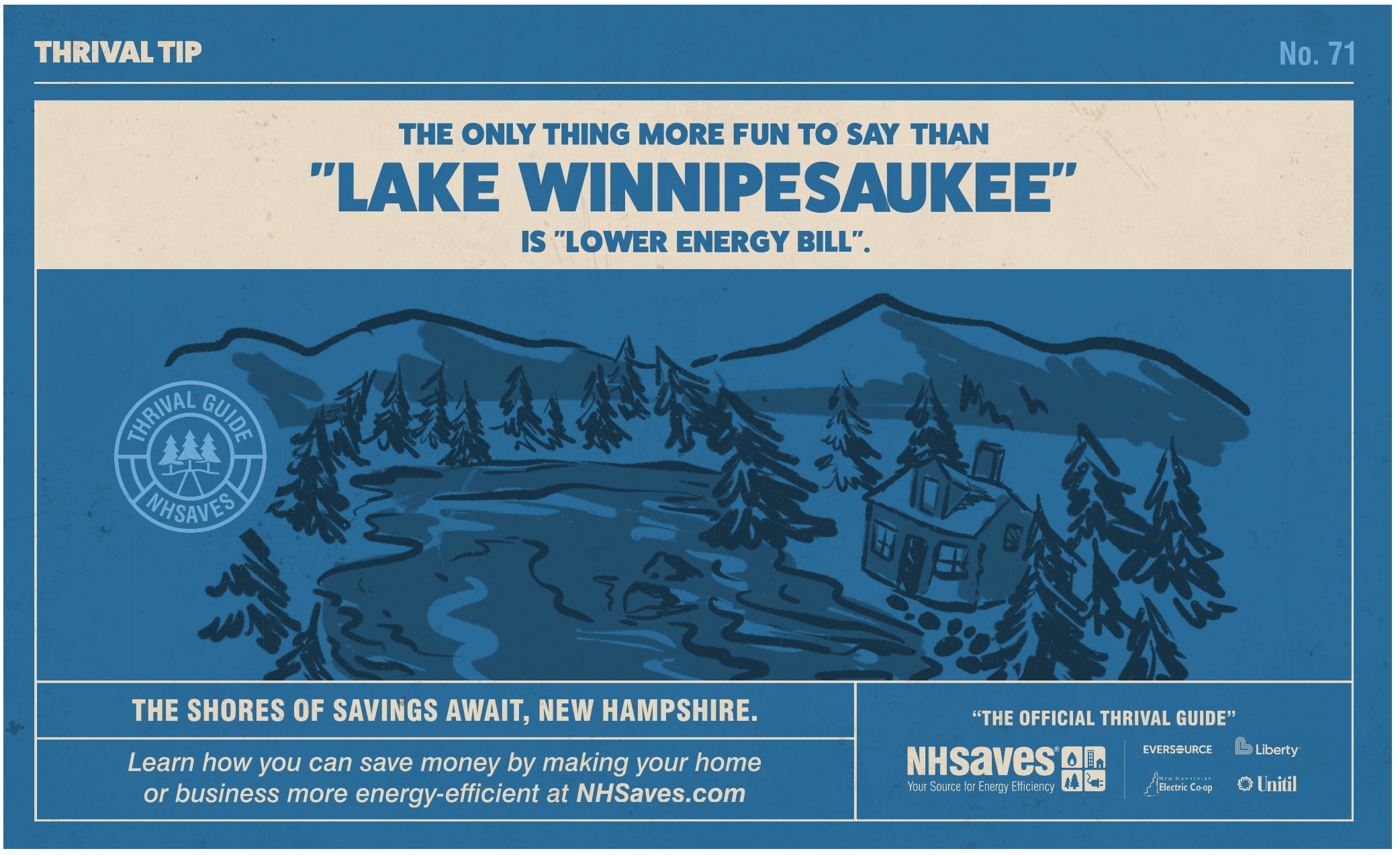 THE ONLY THING MORE FUN TO SAY THAN "LAKE WINNIPESAUKEE" IS "LOWER ENERGY BILL". THE SHORES OF SAVINGS AWAIT, NEW HAMPSHIRE. Learn how you can save money by making your home or business more energy-efficient at NHSaves.com “THE OFFICIAL THRIVAL GUIDE”