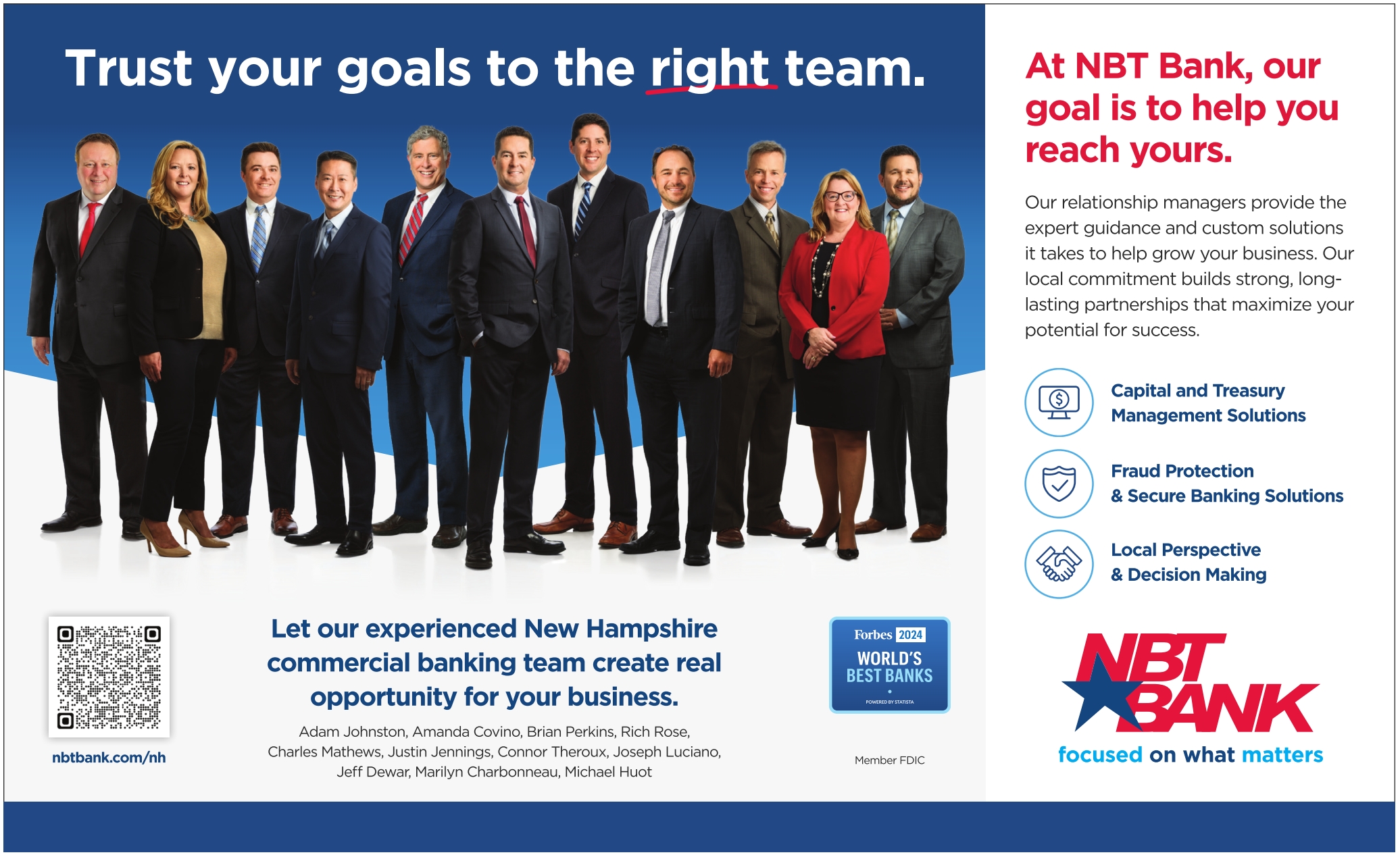 At NBT Bank, our goal is to help you reach yours. Our relationship managers provide the expert guidance and custom solutions it takes to help grow your business. Our local commitment builds strong, longlasting partnerships that maximize your potential for success. Capital and Treasury Management Solutions Fraud Protection & Secure Banking Solutions Local Perspective & Decision Making nbtbank.com/nh Let our experienced New Hampshire commercial banking team create real opportunity for your business. Adam Johnston, Amanda Covino, Brian Perkins, Rich Rose, Charles Mathews, Justin Jennings, Connor Theroux, Joseph Luciano, Jeff Dewar, Marilyn Charbonneau, Michael Huot Member FDIC
