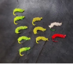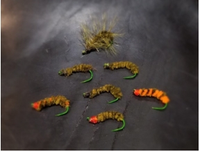 Larger Cageypillars tied by the author on green hooks, with multiple variations. Photo: KG Tidball