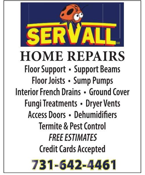 HOME REPAIRS Floor Support • Support Beams Floor Joists • Sump Pumps Interior French Drains • Ground Cover Fungi Treatments • Dryer Vents Access Doors • Dehumidifiers Termite & Pest Control FREE ESTIMATES Credit Cards Accepted