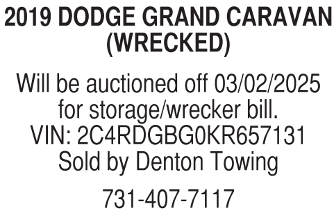 VIN: 2C4RDGBG0KR657131 Sold by Denton Towing