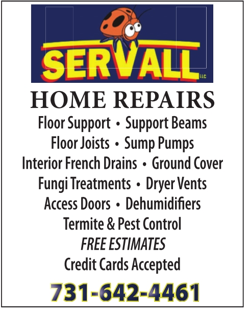 HOME REPAIRS Floor Support • Support Beams Floor Joists • Sump Pumps Interior French Drains • Ground Cover Fungi Treatments • Dryer Vents Access Doors • Dehumidifiers Termite & Pest Control FREE ESTIMATES Credit Cards Accepted