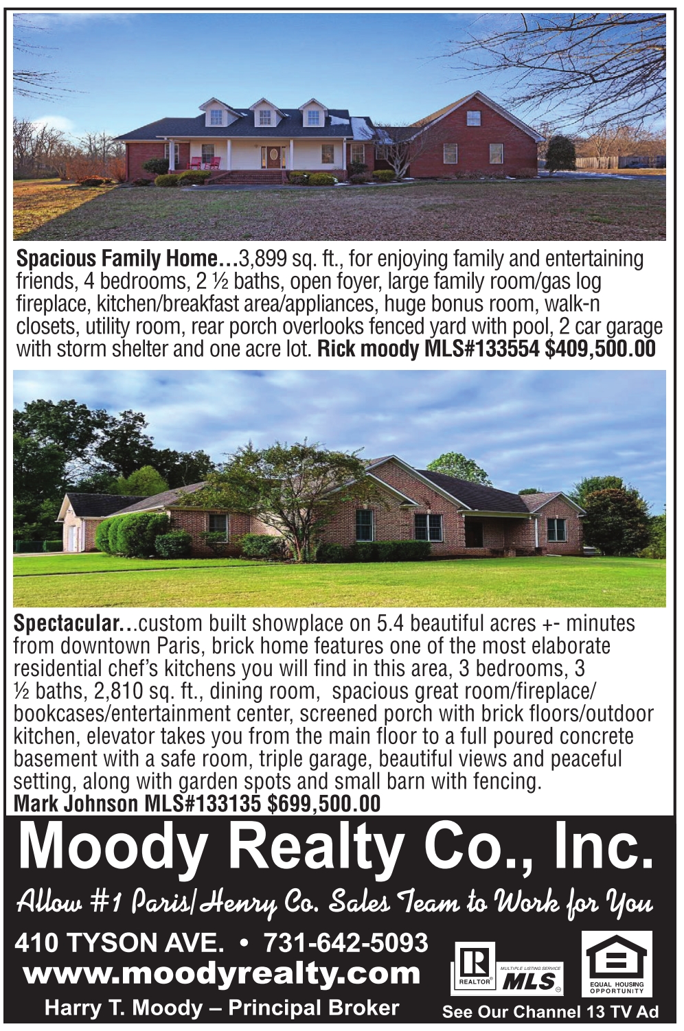 Spectacular...custom built showplace on 5.4 beautiful acres +- minutes from downtown Paris, brick home features one of the most elaborate residential chef’s kitchens you will find in this area, 3 bedrooms, 3 ½ baths, 2,810 sq. ft., dining room, spacious great room/fireplace/ bookcases/entertainment center, screened porch with brick floors/outdoor kitchen, elevator takes you from the main floor to a full poured concrete basement with a safe room, triple garage, beautiful views and peaceful setting, along with garden spots and small barn with fencing. Mark Johnson MLS#133135 $699,500.00 410 TYSON AVE. • 731-642-5093 www.moodyrealty.co Harry T. Moody – Principal Broker See Our Channel 13 TV Ad 410 TYSON AVE. • 731-642-5093 www.moodyrealty.co Harry T. Moody – Principal Broker Moody Realty Co., See Our Channel 13 TV Ad 410 TYSON AVE. • 731-642-5093 www.moodyrealty.com Harry T. Moody – Principal Broker Moody Realty Co., Inc. Allow #1 Paris/Henry Co. Sales Team to Work for You See Our Channel 13 TV Ad Spacious Family Home...3,899 sq. ft., for enjoying family and entertaining friends, 4 bedrooms, 2 ½ baths, open foyer, large family room/gas log fireplace, kitchen/breakfast area/appliances, huge bonus room, walk-n closets, utility room, rear porch overlooks fenced yard with pool, 2 car garage with storm shelter and one acre lot. Rick moody MLS#133554 $409,500.00