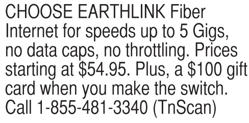 CHOOSE EARTHLINK Fiber Internet for speeds up to 5 Gigs, no data caps, no throttling. Prices starting at $54.95. Plus, a $100 gift card when you make the switch. Call 1-855-481-3340 (TnScan)