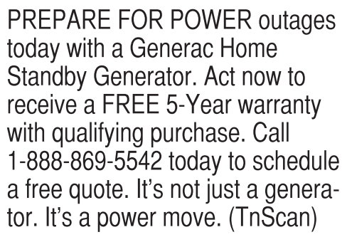 PREPARE FOR POWER outages today with a Generac Home Standby Generator. Act now to receive a FREE 5-Year warranty with qualifying purchase. Call 1-888-869-5542 today to schedule a free quote. It’s not just a generator. It’s a power move. (TnScan)