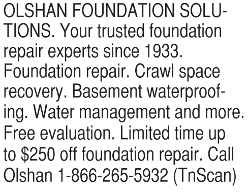 Free evaluation. Limited time up to $250 off foundation repair. Call Olshan 1-866-265-5932 (TnScan)