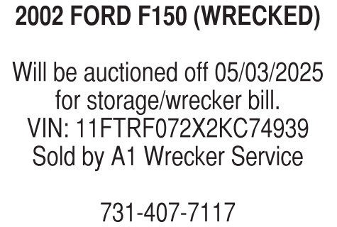 Will be auctioned off 05/03/2025 for storage/wrecker bill.