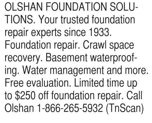 OLSHAN FOUNDATION SOLU- TIONS. Your trusted foundation repair experts since 1933. Foundation repair. Crawl space recovery. Basement waterproofing. Water management and more. Free evaluation. Limited time up to $250 off foundation repair. Call Olshan 1-866-265-5932 (TnScan)