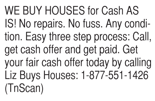 WE BUY HOUSES for Cash AS IS! No repairs. No fuss. Any condition. Easy three step process: Call, get cash offer and get paid. Get your fair cash offer today by calling Liz Buys Houses: 1-877-551-1426 (TnScan)