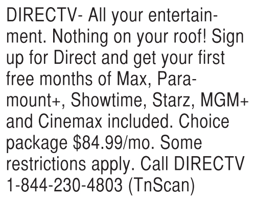 DIRECTV- All your entertainment. Nothing on your roof! Sign up for Direct and get your first free months of Max, Paramount+, Showtime, Starz, MGM+ and Cinemax included. Choice package $84.99/mo. Some restrictions apply. Call DIRECTV 1-844-230-4803 (TnScan)
