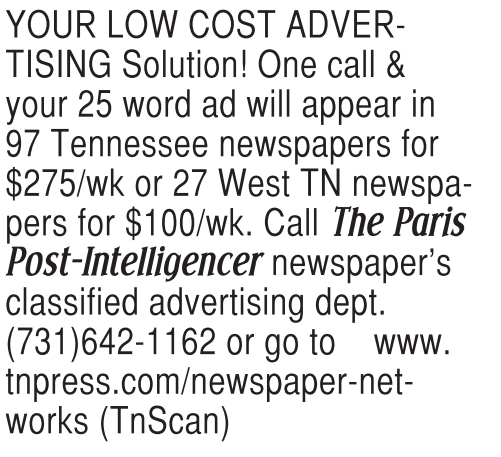 YOUR LOW COST ADVER- TISING Solution! One call & your 25 word ad will appear in 97 Tennessee newspapers for $275/wk or 27 West TN newspapers for $100/wk. Call The Paris Post-Intelligencer newspaper’s classified advertising dept. (731)642-1162 or go to www. tnpress.com/newspaper-networks (TnScan)