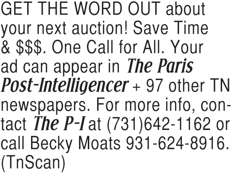 GET THE WORD OUT about your next auction! Save Time & $$$. One Call for All. Your ad can appear in The Paris Post-Intelligencer + 97 other TN newspapers. For more info, contact The P-I at (731)642-1162 or call Becky Moats 931-624-8916. (TnScan)