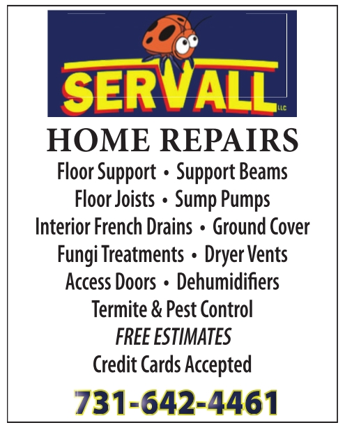 HOME REPAIRS Floor Support • Support Beams Floor Joists • Sump Pumps Interior French Drains • Ground Cover Fungi Treatments • Dryer Vents Access Doors • Dehumidifiers Termite & Pest Control FREE ESTIMATES Credit Cards Accepted
