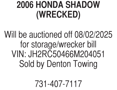 Will be auctioned off 08/02/2025 for storage/wrecker bill VIN: JH2RC50466M204051 Sold by Denton Towing