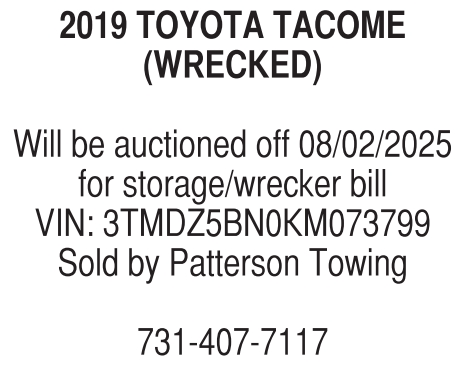 Will be auctioned off 08/02/2025 for storage/wrecker bill VIN: 3TMDZ5BN0KM073799 Sold by Patterson Towing