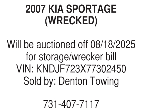 Will be auctioned off 08/18/2025 for storage/wrecker bill VIN: KNDJF723X77302450 Sold by: Denton Towing