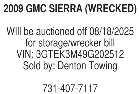 WIll be auctioned off 08/18/2025 for storage/wrecker bill VIN: 3GTEK3M49G202512 Sold by: Denton Towing