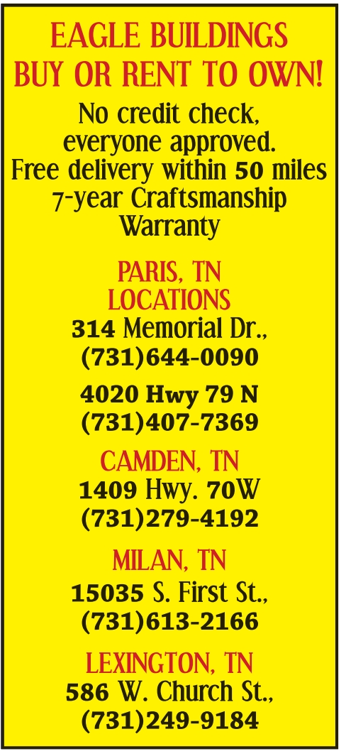 EAGLE BUILDINGS BUY OR RENT TO OWN! No credit check, everyone approved. Free delivery within 50 miles 7-year Craftsmanship Warranty PARIS, TN LOCATIONS 314 Memorial Dr., (731)644-0090 4020 Hwy 79 N (731)407-7369 CAMDEN, TN 1409 Hwy. 70W (731)279-4192 MILAN, TN 15035 S. First St., (731)613-2166 LEXINGTON, TN 586 W. Church St., (731)249-9184