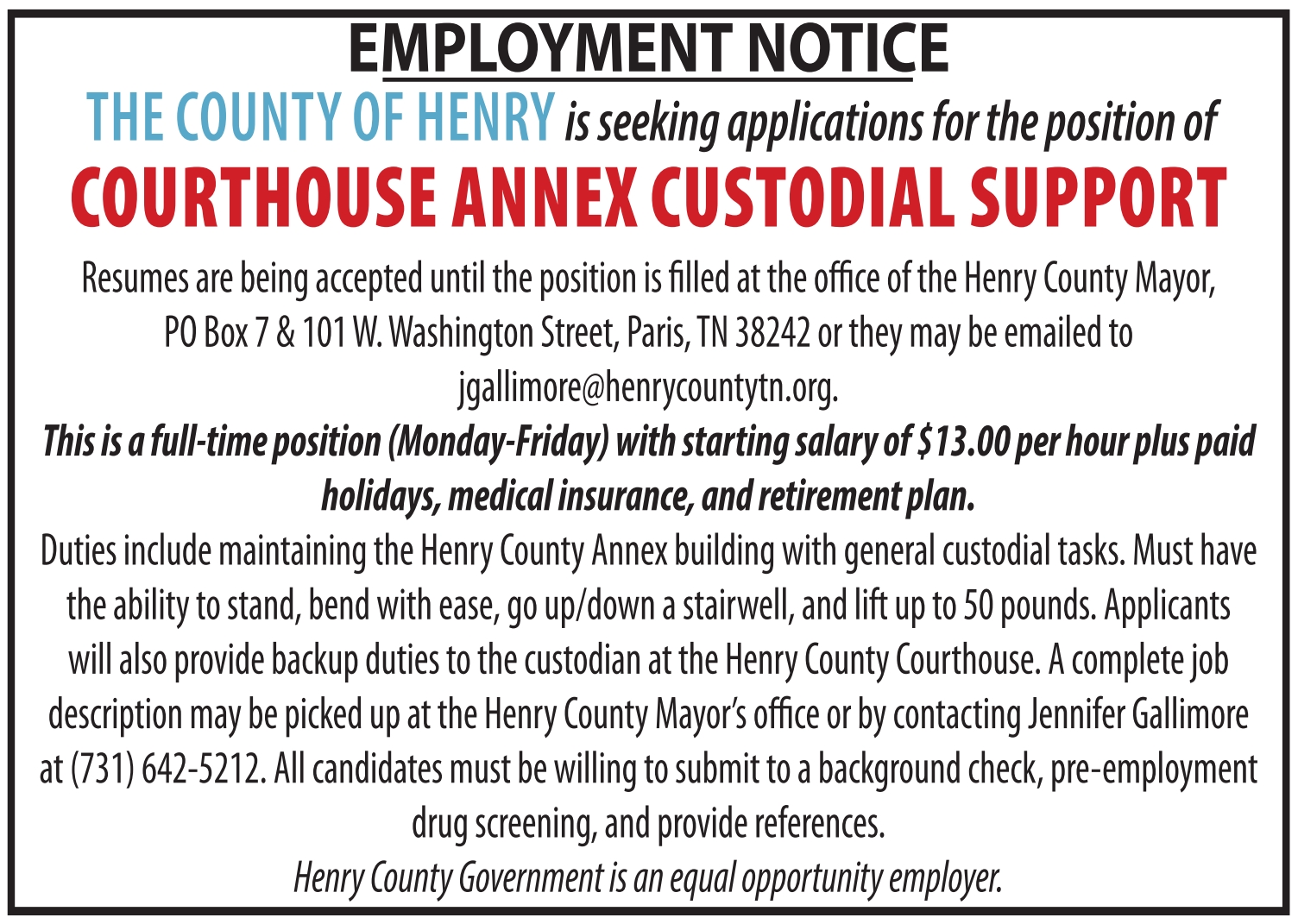 EMPLOYMENT NOTICE THE COUNTY OF HENRY is seeking applications for the position of COURTHOUSE ANNEX CUSTODIAL SUPPORT Resumes are being accepted until the position is filled at the office of the Henry County Mayor, PO Box 7 & 101 W. Washington Street, Paris, TN 38242 or they may be emailed to [email protected]. This is a full-time position (Monday-Friday) with starting salary of $13.00 per hour plus paid holidays, medical insurance, and retirement plan. Duties include maintaining the Henry County Annex building with general custodial tasks. Must have the ability to stand, bend with ease, go up/down a stairwell, and lift up to 50 pounds. Applicants will also provide backup duties to the custodian at the Henry County Courthouse. A complete job description may be picked up at the Henry County Mayor’s office or by contacting Jennifer Gallimore at (731) 642-5212. All candidates must be willing to submit to a background check, pre-employment drug screening, and provide references. Henry County Government is an equal opportunity employer.