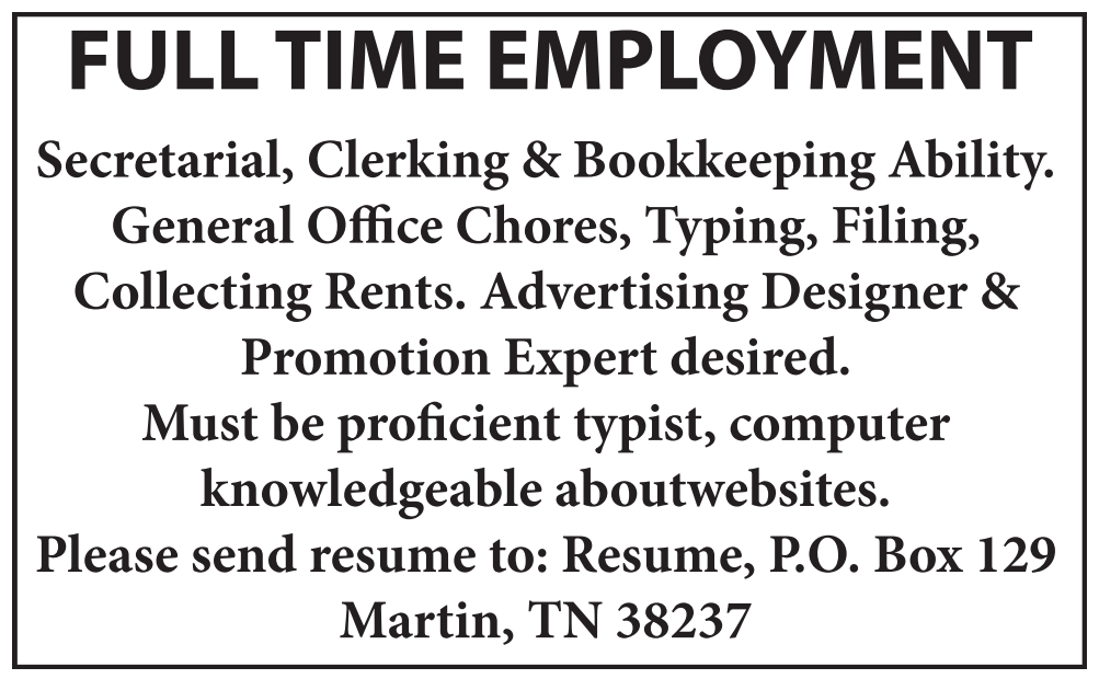 Please send resume to: Resume, P.O. Box 129 Martin, TN 38237