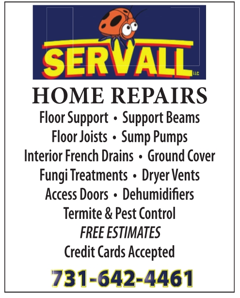HOME REPAIRS Floor Support • Support Beams Floor Joists • Sump Pumps Interior French Drains • Ground Cover Fungi Treatments • Dryer Vents Access Doors • Dehumidifiers Termite & Pest Control FREE ESTIMATES Credit Cards Accepted