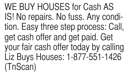 WE BUY HOUSES for Cash AS IS! No repairs. No fuss. Any condition. Easy three step process: Call, get cash offer and get paid. Get your fair cash offer today by calling Liz Buys Houses: 1-877-551-1426 (TnScan)