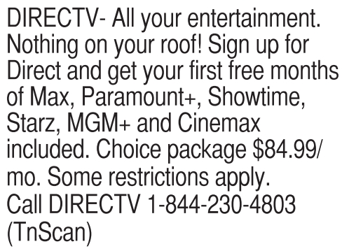 DIRECTV- All your entertainment. Nothing on your roof! Sign up for Direct and get your first free months of Max, Paramount+, Showtime, Starz, MGM+ and Cinemax included. Choice package $84.99/ mo. Some restrictions apply. Call DIRECTV 1-844-230-4803 (TnScan)
