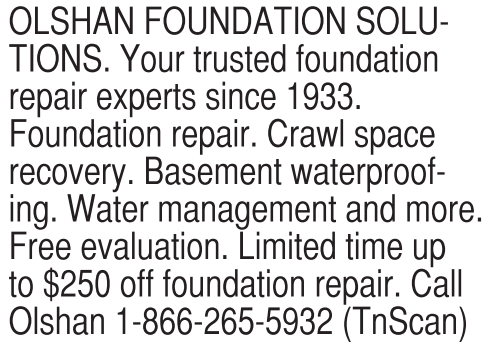 OLSHAN FOUNDATION SOLU- TIONS. Your trusted foundation repair experts since 1933. Foundation repair. Crawl space recovery. Basement waterproofing. Water management and more. Free evaluation. Limited time up to $250 off foundation repair. Call Olshan 1-866-265-5932 (TnScan)