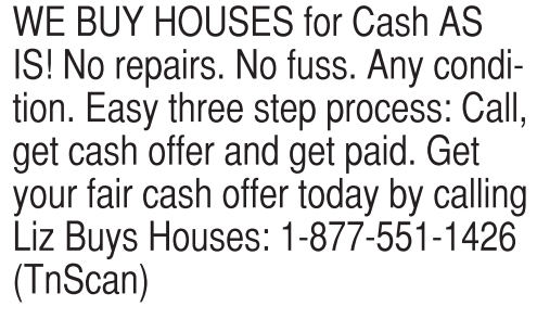WE BUY HOUSES for Cash AS IS! No repairs. No fuss. Any condition. Easy three step process: Call, get cash offer and get paid. Get your fair cash offer today by calling Liz Buys Houses: 1-877-551-1426 (TnScan)
