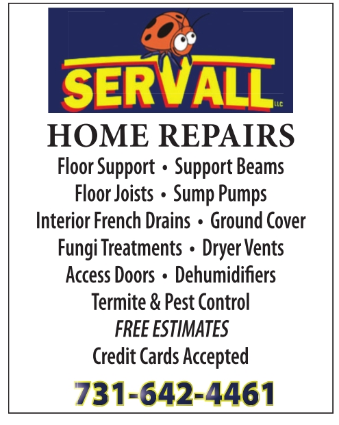 HOME REPAIRS Floor Support • Support Beams Floor Joists • Sump Pumps Interior French Drains • Ground Cover Fungi Treatments • Dryer Vents Access Doors • Dehumidifiers Termite & Pest Control FREE ESTIMATES Credit Cards Accepted