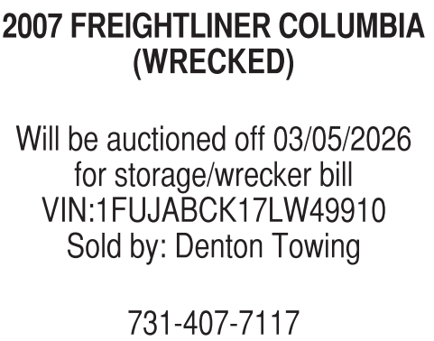 Will be auctioned off 03/05/2026 for storage/wrecker bill VIN:1FUJABCK17LW49910 Sold by: Denton Towing