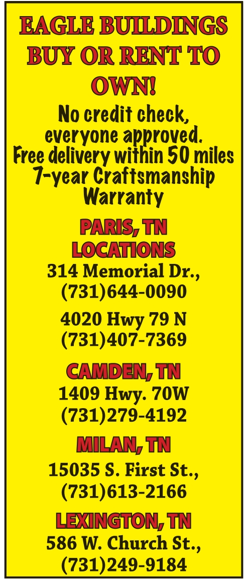 EAGLE BUILDINGS BUY OR RENT TO OWN! No credit check, everyone approved. Free delivery within 50 miles 7-year Craftsmanship Warranty PARIS, TN LOCATIONS 314 Memorial Dr., (731)644-0090 4020 Hwy 79 N (731)407-7369 CAMDEN, TN 1409 Hwy. 70W (731)279-4192 MILAN, TN 15035 S. First St., (731)613-2166 LEXINGTON, TN 586 W. Church St., (731)249-9184