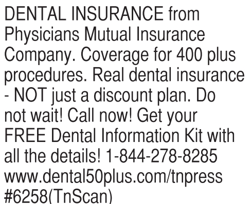 DENTAL INSURANCE from Physicians Mutual Insurance Company. Coverage for 400 plus procedures. Real dental insurance - NOT just a discount plan. Do not wait! Call now! Get your FREE Dental Information Kit with all the details! 1-844-278-8285 www.dental50plus.com/tnpress #6258(TnScan)