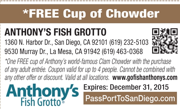 *One FREE cup of Anthony’s world-famous Clam Chowder with the purchase of any adult entrée. Coupon valid for up to 4 people. Cannot be combined with any other offer or discount. Valid at all locations. www.gofishanthonys.com Expires: December 31, 2015 PassPortToSanDiego.com
