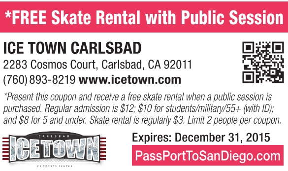 *Present this coupon and receive a free skate rental when a public session is purchased. Regular admission is $12; $10 for students/military/55+ (with ID); and $8 for 5 and under. Skate rental is regularly $3. Limit 2 people per coupon.